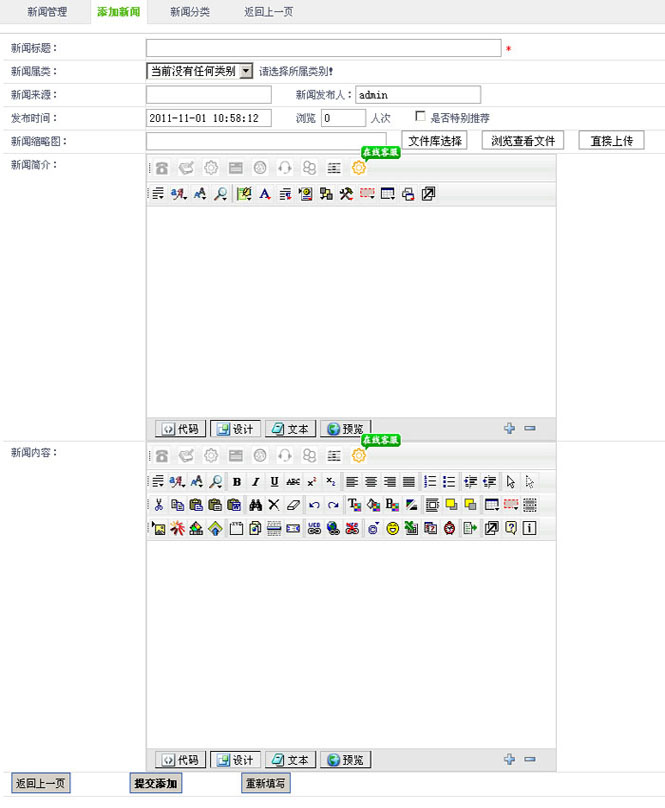 7.在“新闻缩略图”字段,可以选择直接上传和文库选择,添加您新闻的图片。