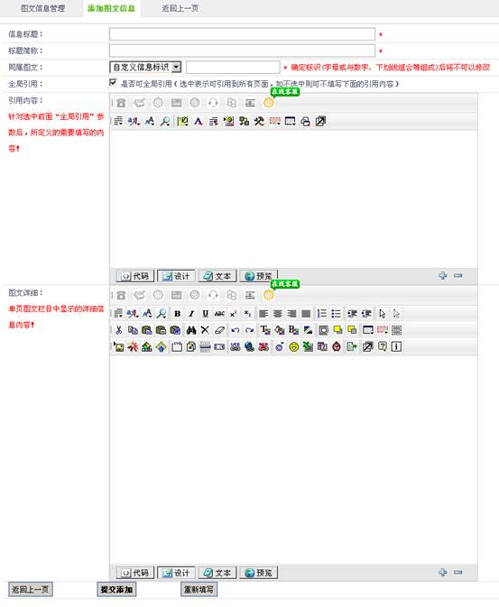 1.在“信息标题”字段,填写图文的标题名称2.在“标题简称”字段,填写图文的标题简称。3.在“同属图文”字段,填写显示同属图文。( 确定标识(字母或与数字、下划线组合等组成)后将不可以修改)4.在“全局引用”字段,设置(选中表示可引用到所有页面,如不选中则可不填写下面的引用内容)。5.在“引用内容”字段,填写图文需全局引用内容。6.在“图文详细”字段,填写图文信息详细内容。