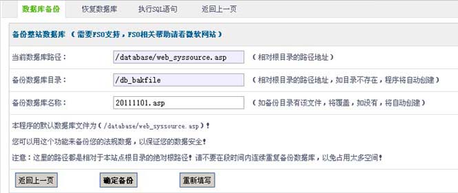 注意:这里的路径都是相对于本站点根目录的绝对根路径!请不要在段时间内连续重复备份数据库,以免占用太多空间!