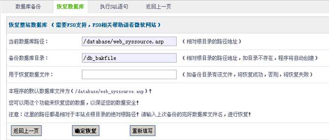 本程序的默认数据库文件为(/database/web_syssource.asp)!您可以用这个功能来恢复您的数据,以保证您的数据安全!注意:这里的路径都是相对于本站点根目录的绝对根路径!请输入上次备份的完好数据库文件名,进行恢复!